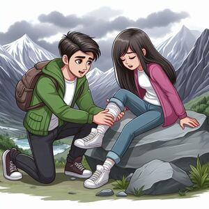Alex loved hiking in the mountains. He had always enjoyed the peaceful trails. One day, he was having a hard time with a steep path. He was trying to go fast, saving time. Suddenly, he heard a cry for help. He looked around. A young woman had slipped on a wet rock and sprained her ankle.
